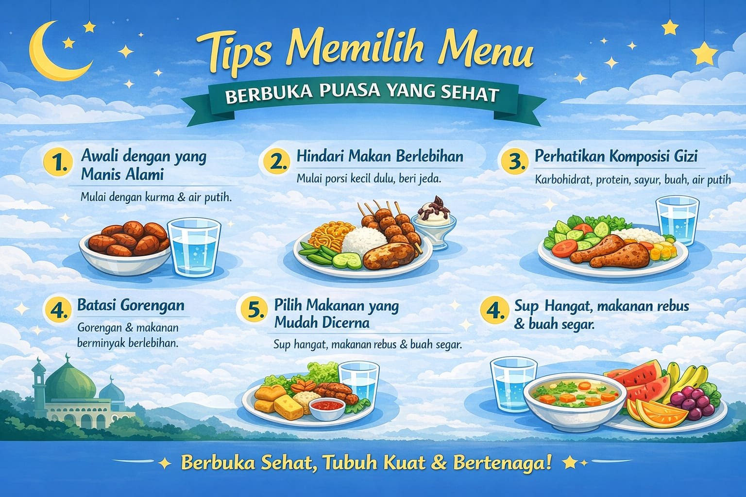 Berbuka puasa adalah momen yang paling dinanti setelah seharian menahan lapar dan haus. Namun, memilih menu berbuka tidak boleh asal-asalan. Tubuh yang kosong selama berjam-jam membutuhkan asupan yang tepat agar energi kembali tanpa menimbulkan gangguan pencernaan. Berikut beberapa tips memilih menu berbuka puasa yang sehat dan seimbang.
